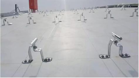 该项目屋面防水等级为一级,在屋面围护系统中,指廊部分采用1.5mm织物内增强型TPO防水卷材设置于镀锌钢板与岩面保温层间,通过镀锌钢支座机械固定于几字形檩条,搭接边采用热风焊接工艺。核心区与指廊区采光带间、采光带与屋面间通过天沟进行分隔,天沟部分采用2.0mm织物内增强型TPO防水卷材,防水层采用底部无穿孔固定+天沟侧壁满粘的工法,防水层完成后卷材直接外露使用。