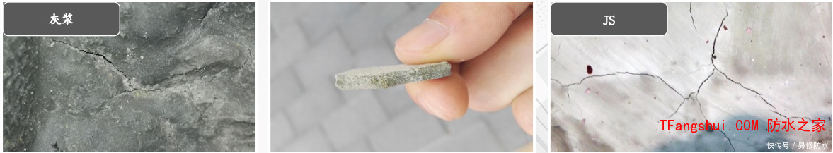 问题分析:在刷防水涂料前,基层上有弹性较大的物质,涂料干燥过程中柔性基层不能有效限制其收缩,导致灰浆防水层开裂。
