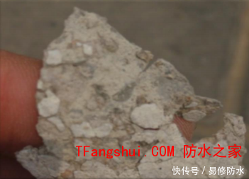 问题分析:将起鼓的防水层揭下后,会发现防水层背面粘结大量的浮尘杂物。这主要是由于墙体基层存在起砂、不坚实、疏松或大量的浮土、浮灰等,导致防水层与基层的结合不稳定,闭水试验时水压导致涂膜再次收缩。
