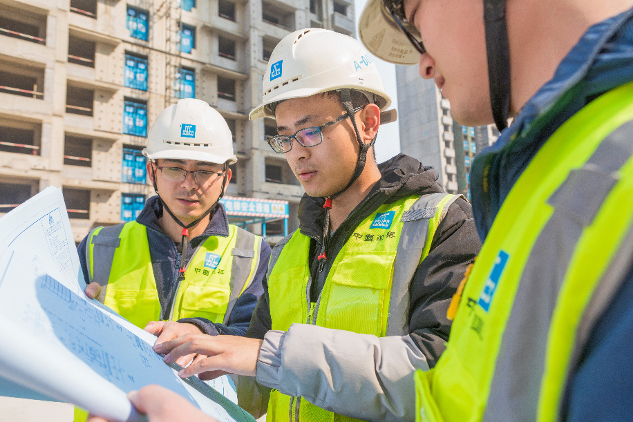 核心提示: 10月14日,中建三局山东分公司济南中海华山项目技术员任晓天正在做屋面防水做法现场图纸交底,他与商务经理、质检员讨论如何