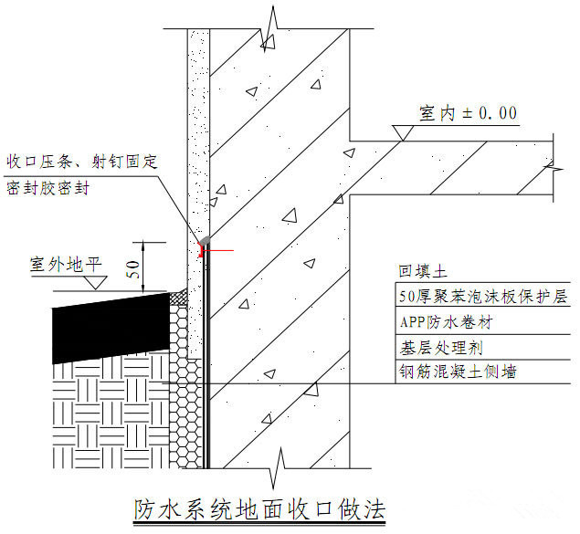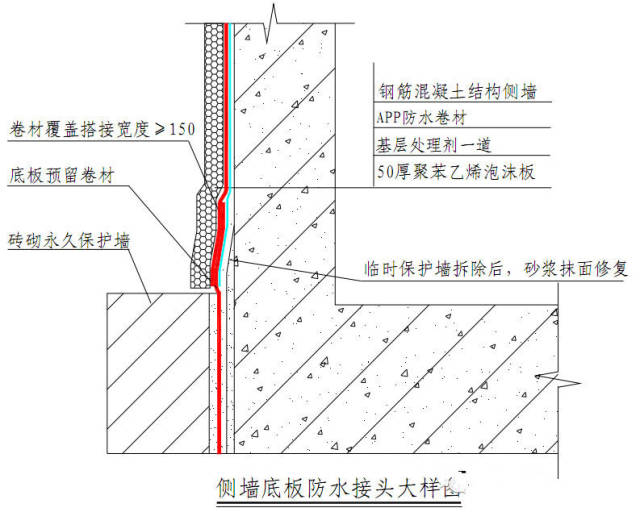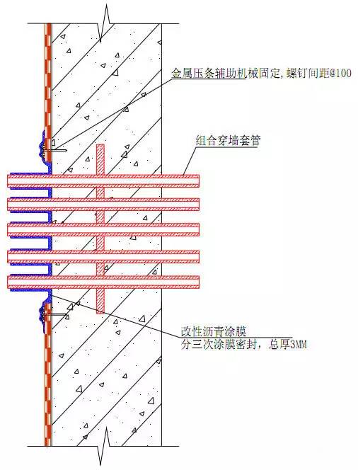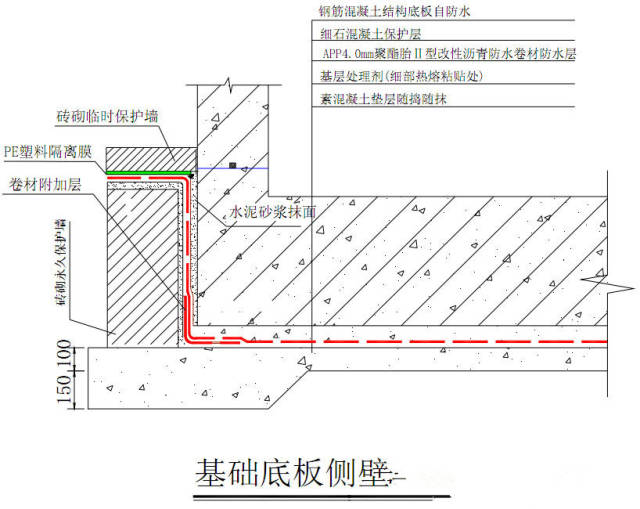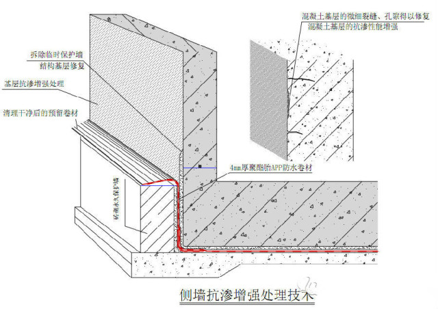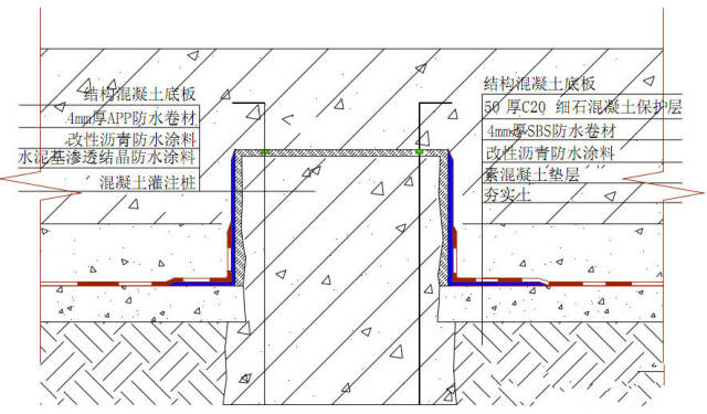 采用水泥基渗透结晶型防水涂料 +改性沥青防水涂料 +卷材的复合防水做法。