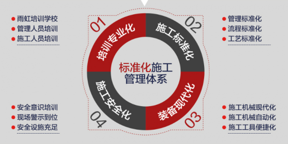 而雨虹防水的标准化施工管理体系,包括培训专业化、施工标准化、装备现代化、施工安全化。其中,施工标准化主要包括有施工管理标准化、施工流程标准化、施工工艺标准化。在标准化施工体系的实施过程中,雨虹防水通过岗前培训、施工安排部署、样板示范、标准化施工装备、现场管理、安全为先、工程实时追踪形成了标准化全链条服务。