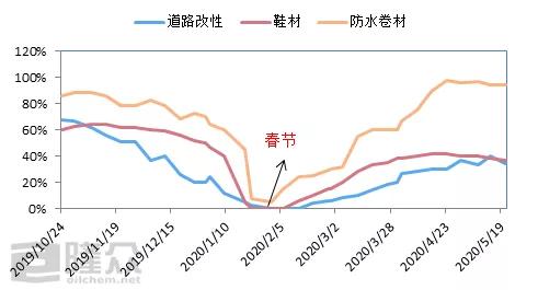 如上图“花朵”一样展开的线条可以看出,对比其他终端行业,防水卷材行业作为我国基础建设的刚需,3月份的“复工复产”初露端倪,4-5月份9成以上开工强力提振SBS行情。据隆众资讯调研可知,国内知名防水企业如东方雨虹、宏源集团、科顺防水、卓宝防水及雨中情防水等国内前十名企业开工高位,月开工率达到了9成以上,并且4月SBS市场报盘跌至历史底位,也促成了第二季度初的多笔大单成交。
