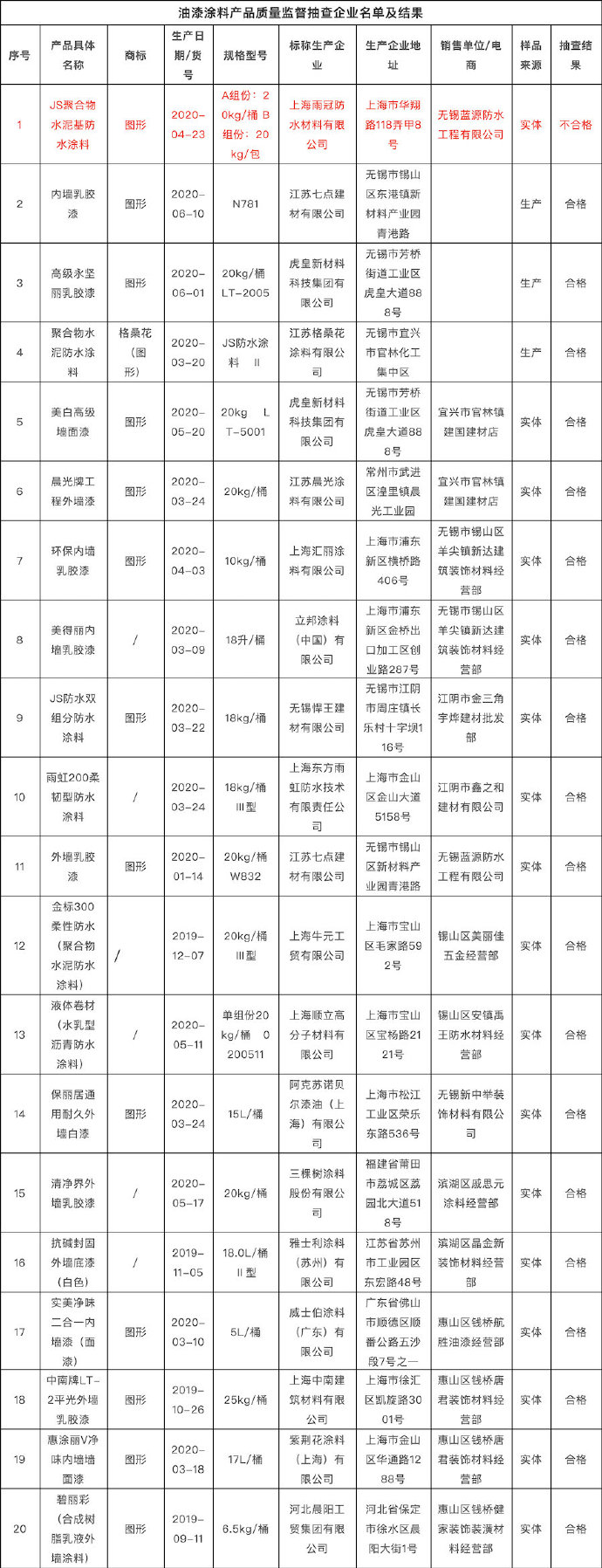 其中,上海雨冠防水材料有限公司生产、无锡蓝源防水工程有限公司销售的1批次JS聚合物水泥基防水涂料不合格,不合格项目为固体含量和游离甲醛。