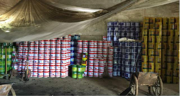 日前,湖南省湘潭县市场监管局接到群众举报,称白石镇一农户老宅内有人生产多种防水涂料,怀疑是假冒伪劣产品。接到举报后该局执法人员连同乡镇工作人员第一时间赶往现场,发现印有6家厂名厂址的防水涂料成品900桶,用于生产的原材料20余吨、空桶2000余个,执法人员现场予以依法查封。经营者欧某因涉嫌无证无照并伪造或冒用他人厂名厂址生产经营防水涂料被立案调查。