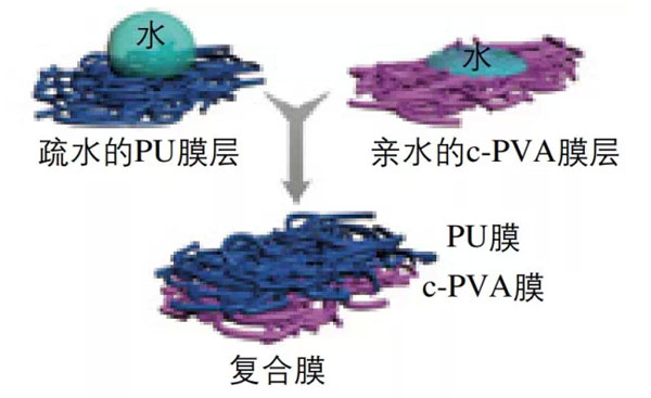 有研究人员采用电纺法把PU微孔膜层直接涂覆在准备好的亲水膜层中(图1),制备的复合膜中包含有疏水的PU膜层和亲水的聚乙烯醇(c-PVA)膜层。在复合膜中,疏水段具有防水性,而且水能自发的从疏水段流向亲水段;在亲水段可以通过水蒸汽。目前多微孔亲水膜在防护服中还没得到广泛的应用,但是这种具有特殊性能的复合膜有着很大的发展前景。