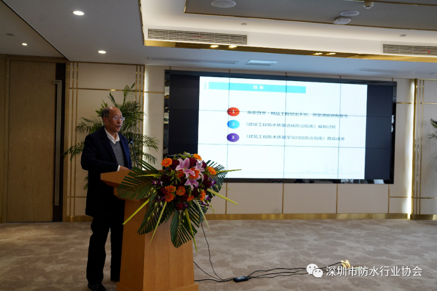 本书主编,深圳市住房和建设局副局长、党组成员郑晓生发表讲话。他说明了修编本书的必要性和积极性:一因结构质量,环保质量,功能质量,观感质量,四大板块中,防水质量是工程质量的灵魂,所以要尤为重视,需将防水常见问题作为重点提出;二因人们对美好生活的追求与行业发展的不均衡,而建筑防水质量与人民群众生活息息相关;三因要达到观感,环保、质量,功能相铺相成共建优秀建筑;四因现在是产业改革,推动新型工业化阶段,但现阶段工业化工程占比太少,大量的工程还处在传统的工艺阶段,防水工程常见问题依然是当前的突出矛盾,用合理作业方式消除质量常见问题,才是现阶段工业化的一个核心的目标;五因建筑的使用功能是最考验工匠精神,而国内形势基本为手工作业,防水工程全部是由工人一砖一瓦、一手一脚精雕细琢出来的,所以工程的质量和功能最能够体现建筑业的工匠精神,而工人的培训需要有优秀的、与时俱进的标准、指导书籍作为高质量发展的配套指南,所以修编《防治指南》顺应了发展高质量工程的需要,是很有必要的。