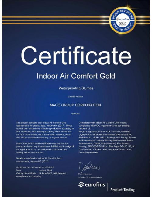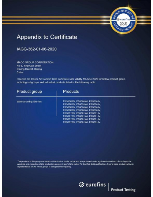 (图片源于欧洲Eurofins Indoor Air Comfort金级认证证书)