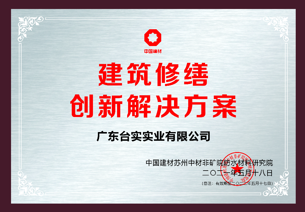 作为国内最早的建筑防水材料生产企业之一,台实在行业以建筑防水、建筑修缮两大领域的创新精神见长。公司以“让建筑健康长寿”为企业使命,以成为“建筑系统诊治专家”为目标,多年来注重生产产能、品牌宣传和营销网络的投入和提升,一直为社会、行业和客户提供完整的一站式建筑防水、建筑修缮方案。鉴于其卓越的修缮技术,被行业单位授予《中国建筑防水堵漏修缮定额标准》编制专家证书,为助力行业的标准化发展做出巨大贡献。此次获得“建筑修缮创新解决方案”和“建筑防水行业最具影响力品牌企业”两项重量级荣誉,台实将以此为起点,再创新高,争取获得更多的荣誉。