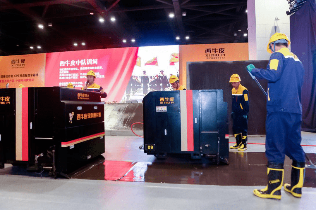 在发布会现场,西牛皮中队进行了防水层基因缺陷现场修复演示,细部节点加强,CPS反应粘防水卷材防水层大面铺贴,以及西牛皮现制防水施工演示。再一次体现了这支防水“铁军”军事化管理、机械化施工,“基面不处理不放过,节点不加强不放过,机械不作业不放过,保护措施责任不落实不放过”的先进施工理念和高水平、高质量施工技术。