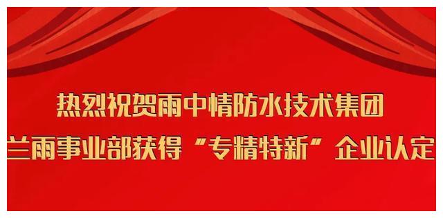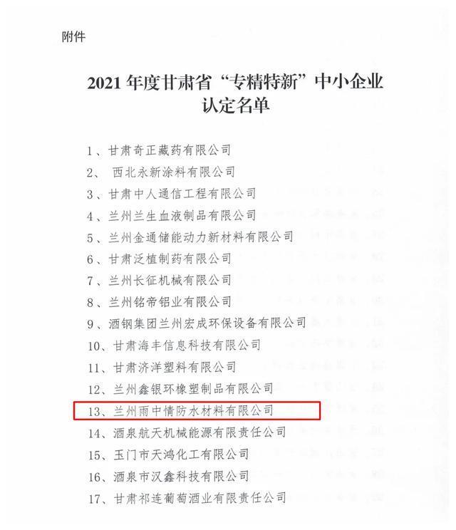 根据甘肃省工业和信息化厅通知文件,雨中情防水技术集团兰雨事业部成功通过评审,被认定为2021年度甘肃省“专精特新”中小企业。