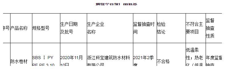 3批次防水卷材产品抽查不合格