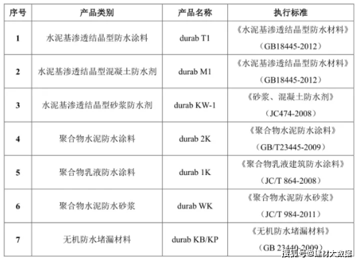 目前,上海凯顿百森拥有水泥基渗透结晶型防水涂料、水泥基渗透结晶型混凝土防水剂、水泥基渗透结晶型砂浆防水剂、聚合物水泥防水涂料、聚合物乳液防水涂料、聚合物水泥防水砂浆、无机防水堵漏材料等全系列的防水产品组合,广泛适用于地下室、隧道、路桥、电站、饮用水工程等需要良好防水抗渗效果的水泥混凝土结构,并可根据工程实际情况及需求进行多元化组合,为客户精心打造高品质的durab®防水系统工程解决方案。