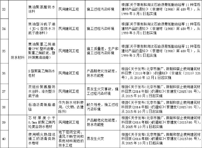 5月6日,北京市住房和城乡建设委员会、北京市规划和自然资源委员会、北京市城市管理委员会联合发布《北京市禁止使用建筑材料目录 (2018年版)》,这一版增加了萘系减水剂等5种禁止使用的建筑材料及设备,禁止使用的原因主要包括污染环境、生产过程污染大、浪费能源等。从今年10月1日起,将禁止在北京的民用建筑中使用。
