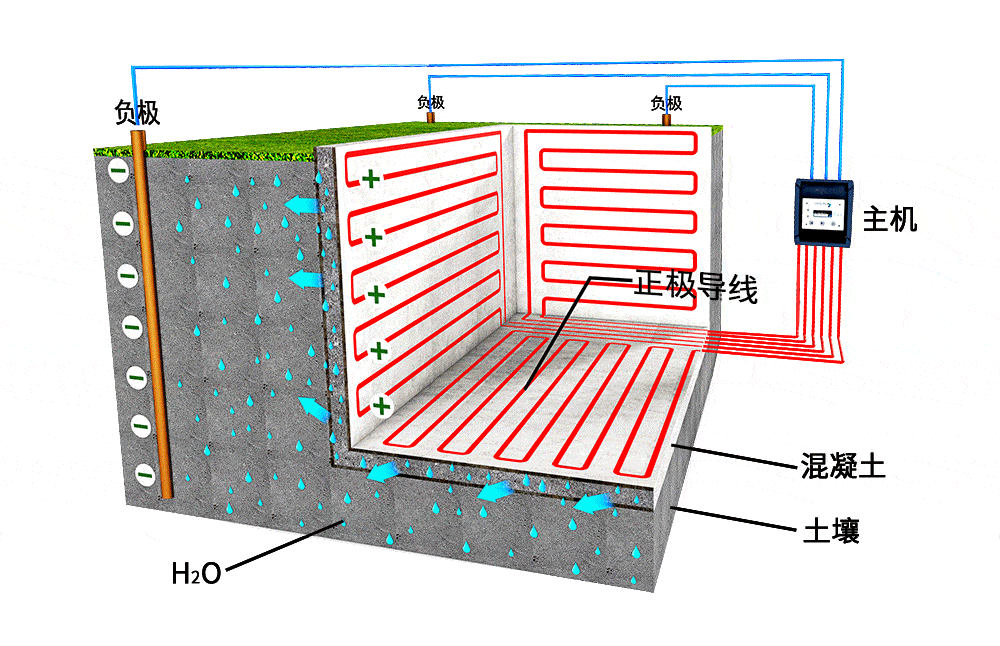 它采用安装正负极的方法,将地下室结构墙内正极性的水分子主动的朝室外负极移动,从而使地下室干燥舒适。