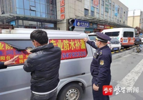 整治中,执法人员告知经营车主,车身广告需依据《户外广告登记管理规定》向工商行政管理机关审批并登记备案,设置还需遵循《中华人民共和国道路交通安全法实施条例》相关规定,车身张贴的广告不得影响驾驶安全,不能将车侧窗与后窗贴满广告。依据《江苏省城市市容和环境卫生管理条例》相关规定,执法人员责令车主自行清除车顶与车窗玻璃违规广告,并督促其在机动车泊位内规范停车,不得阻碍交通安全,对于拒不整改的车主,将最高处以5000元的罚款。