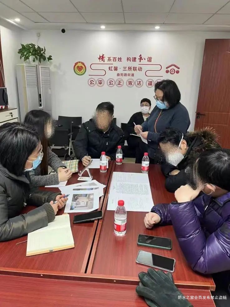 诸多问题导致排查维修进度一直无法推进,漏水渗水情况也越发严重,现在已经蔓延到了101室、103室和201室,居委也收到了越来越多的居民求助,为此曲阳路街道司法所立即启动“三所联动”机制,一方面由社区法律顾问为漏水波及的居民指导诉讼流程,帮助居民起诉维权;另一方面由居委积极与202室的居民联系,司法所与街道房办沟通修缮方案,与社区法官了解起诉后续的流程以及最终审判解决执行所需的时间等问题。