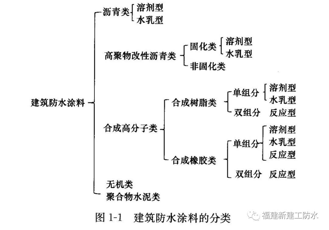建筑防水涂料是建筑涂料的一个分支,其分类参见下图。建筑防水涂料按其主要组成材料可分为沥青类、高聚物改性沥青类(亦称橡胶沥青类)、合成高分子类(又可再分为合成树脂类和合成橡胶类)、无机类、聚合物水泥类等五大类。按其涂料成膜形式的不同可分为固化类和非固化类两大类;按涂料状态与形式的不同,大致又可以分为溶剂型、水乳型和反应型三大类。