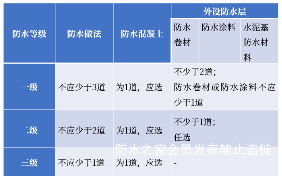 据此《防水强条》要求,当地下室结构底板防水的等级要求为一级时,外设防水层不得少于2道,防水卷材或防水涂料不应少于1道。《防水强条》4.2明挖法地下工程:主体结构防水做法应符合表4.2.1的规定。
